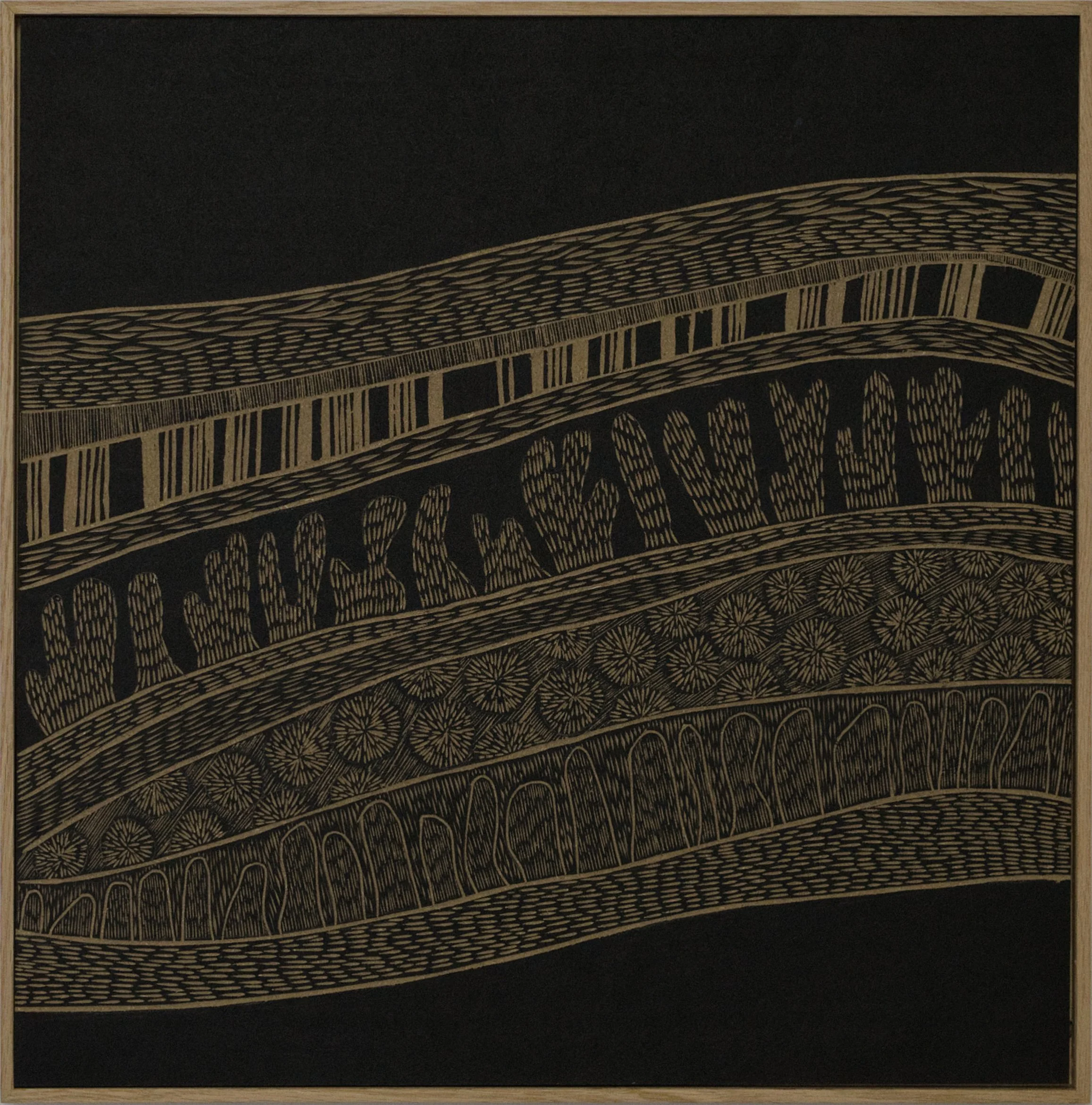 7 layer cell membrane #1 (2 piece), May 2023. 53 x 43 cm with frame. Woodcut on MDF with Sumi Ink. 400 euros