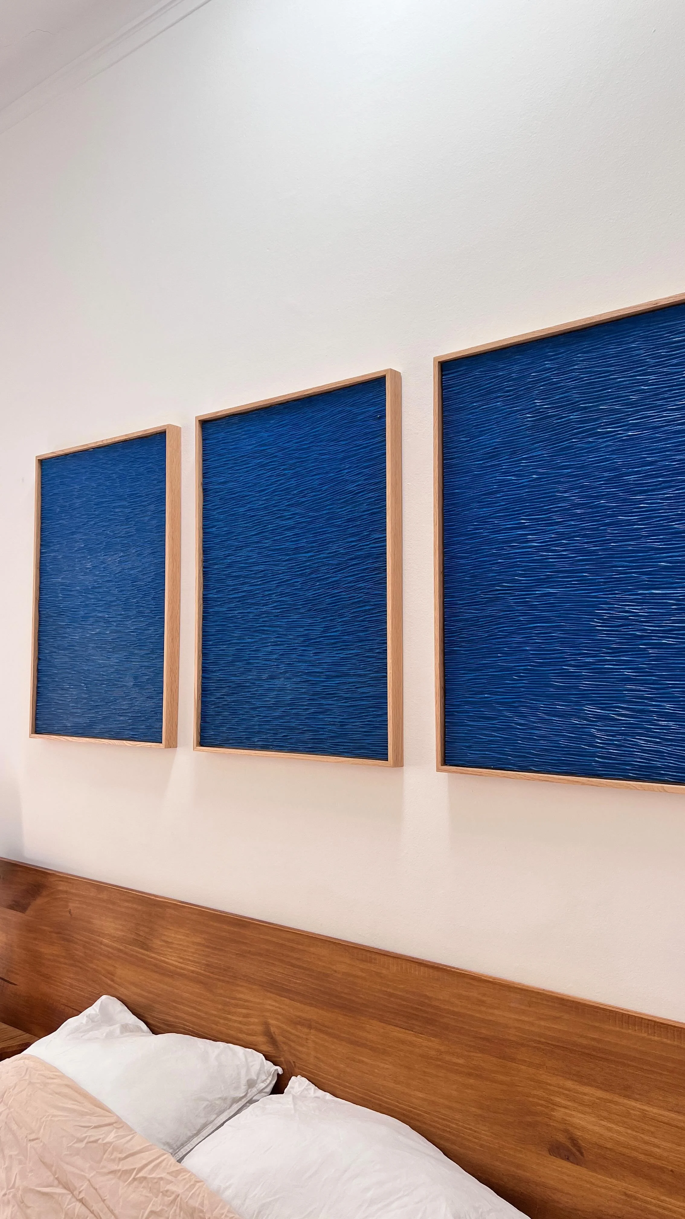 My grandmother filled hundreds of notebooks with the same mantra written daily through quiet, intentional repetition. Her ritual became a blueprint for how I understand meaning: not as a destination, but as something revealed through steady focus. Repetition sits at the centre of my practice. Each mark functions like a step, a breath, or a mantra—accumulating into geometric structures that hold both order and fluidity. Although my process is rooted in woodcut printmaking, I never create prints; the carved panel itself is the final work. Meaning emerges in the carving rather than in its reproduction, making the matrix both the method and the artwork.